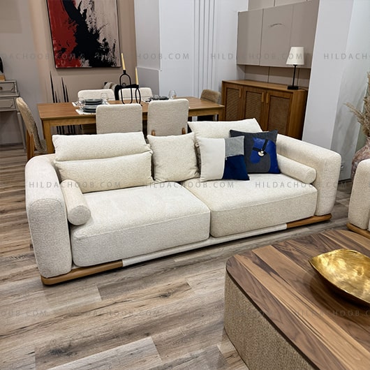 نشیمن مبلها مجهز به تشک دوبل و ابر ۳۵ کیلویی یورولوکس است که راحتی فوقالعاده و حفظ فرم در طول زمان را فراهم میسازد. پارچهی استفادهشده از نوع کامفورد بوده که بافتی لطیف، مقاوم و کاملاً مناسب استفاده روزمره دارد.
